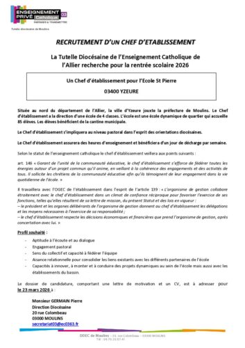 Annonce recrutement CE – St Pierre – Yzeure -rentrée 2026 – Oliva Rakotomalala2026-02-10T15:51:56+01:0010/02/2026|