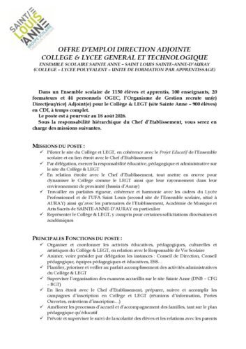 APPEL A CANDIDATURES DIRECTION ADJOINTE COLLEGE & LEGT – ENSEMBLE SCOLAIRE SAINTE ANNE – SAINT LOUIS SAA 290126 Oliva Rakotomalala2026-01-30T15:05:22+01:0030/01/2026|
