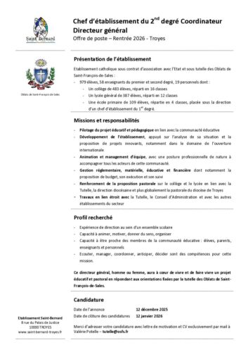 Offre de poste Chef d’Etablissement du 2nd Degré Coordinateur. St Bernard – Troyes Oliva Rakotomalala2025-12-15T09:19:45+01:0015/12/2025|