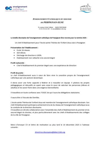 Profil de poste chef d’établissement école sainte Thérèse Perpignan rentrée 2026 Oliva Rakotomalala2025-11-13T09:45:12+01:0013/11/2025|